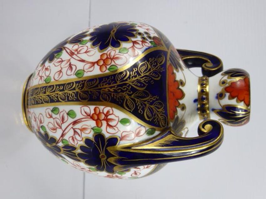Late 19th Century Crown Derby Imari Pattern Twin Handled Vase, approx 14 cms, puce mark to base.