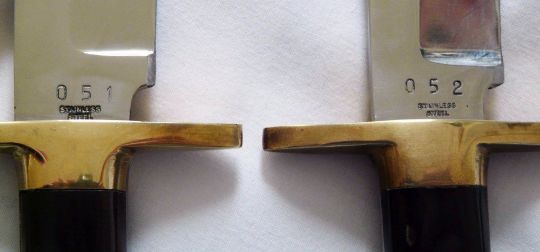 A Pair of Bowie Knives by STUD of London, hand made in England by Master Cutler Keith Moorby during the 1980's, the handles of polished horn. Each knife measures approx 25 cms.