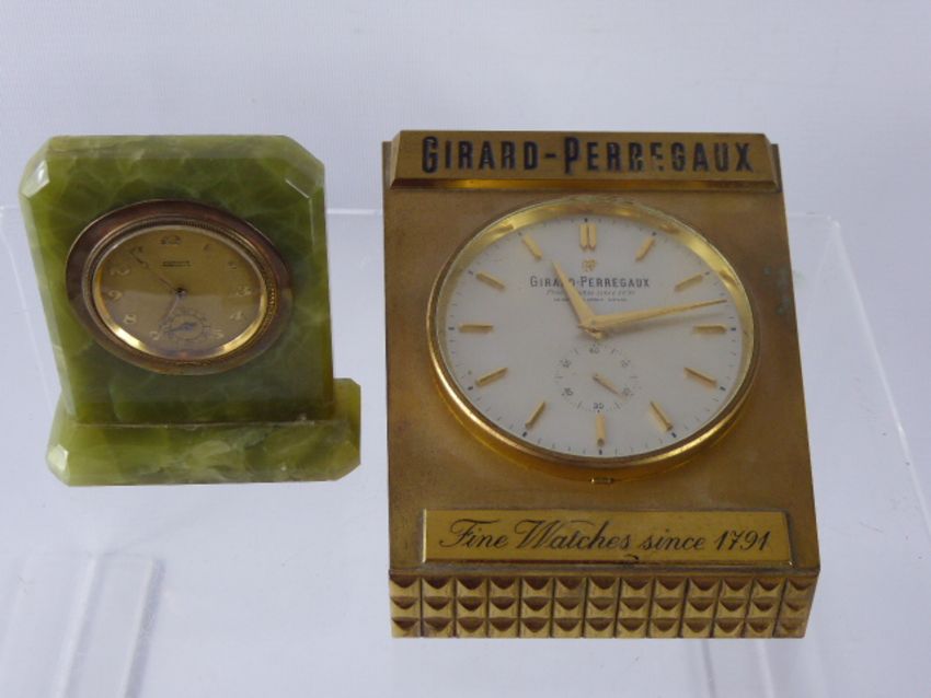 A Vintage Girard Perregaux Table Top Electric Clock, the clock has a Reform Brevet movement, in brass case, the clock having baton numerals with minute dial together with a green marble cased Normis desk clock. (2)