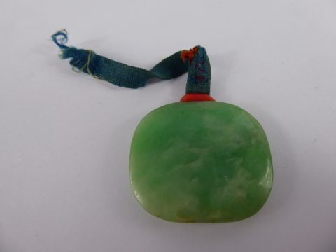 A Chinese Antique Apple Green Circular Form Jade Amulet / Pendant, on fine silk with coloured ivory finial, approx 4 x 3.5 cms, the pendant having vivid green inclusions.