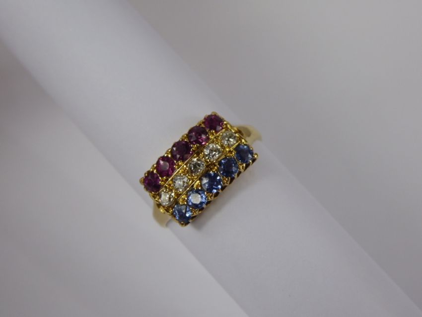 A Lady's 18 ct Yellow Gold Diamond, Sapphire and Ruby Ring, 5 x old cut dias, approx 18 pts, 5 x rubies 2.25 mm, 5 x sapps 2.25 mm, size O, approx 3.5 gms