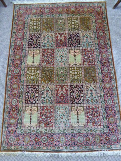 A Fine 20th Century Persian Qum Silk Rug, depicting thirty individual panels of various foliate designs, within an outer floral border, approx 110 x 160 cms