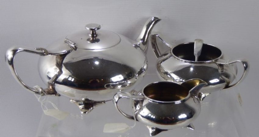 Dixon's Art Nouveau Silver Plate Tea Pot Trio, including tea pot, twin handled sugar bowl, milk jug together with a boxed set of coffee spoons and sugar tongs and a solid silver mustard spoon, Glasgow hallmark, dated 1847.