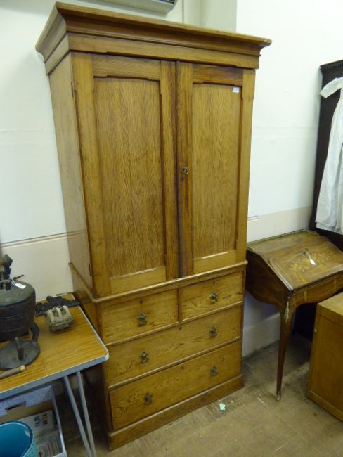 A Vintage Pitch Pine Linen Cupboard, the cupboard having three shelves with two short and two long drawers, cornice to top with brass drop handles, approx 90 x 53 x 203 cms.
