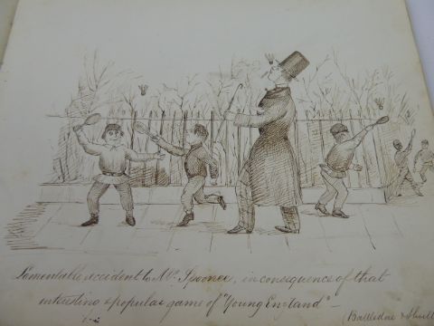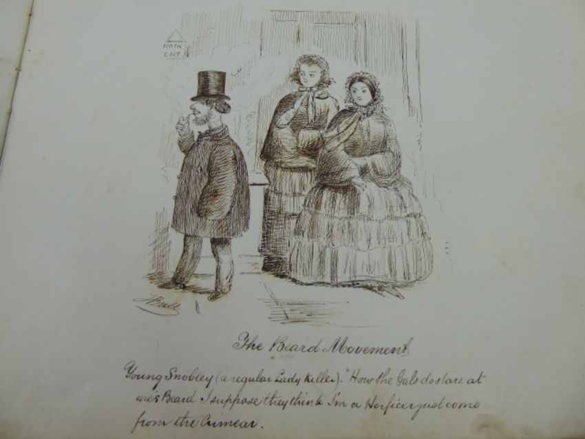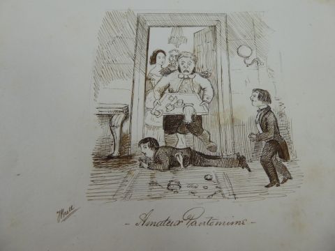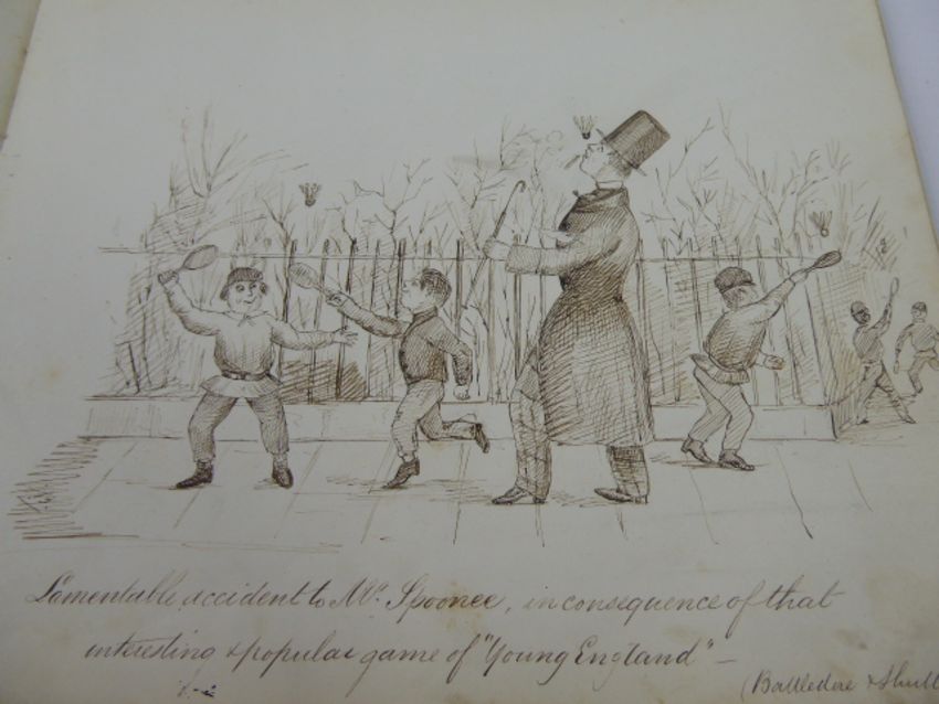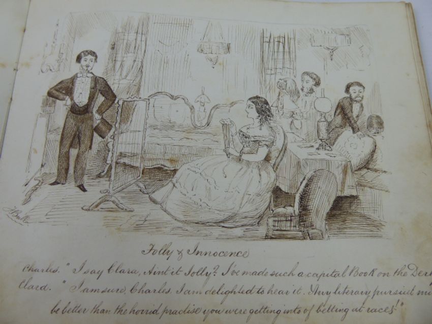 An Antique Red Leather Covered Sketch Book, the containing humorous caricatures in the 19th century style, approx 14 drawings in total, the front cover is signed Eliza Moss.