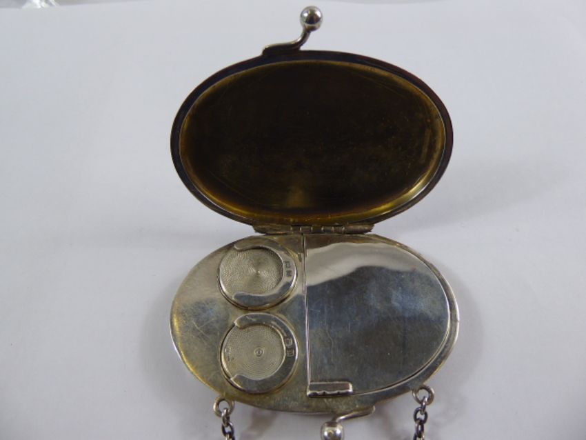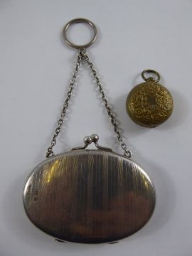 A Vintage Silver Purse, engine turned with chain, Birmingham hallmark, mm Mappin & Webb, dated 1912 together with a gilt metal sovereign case. (2)