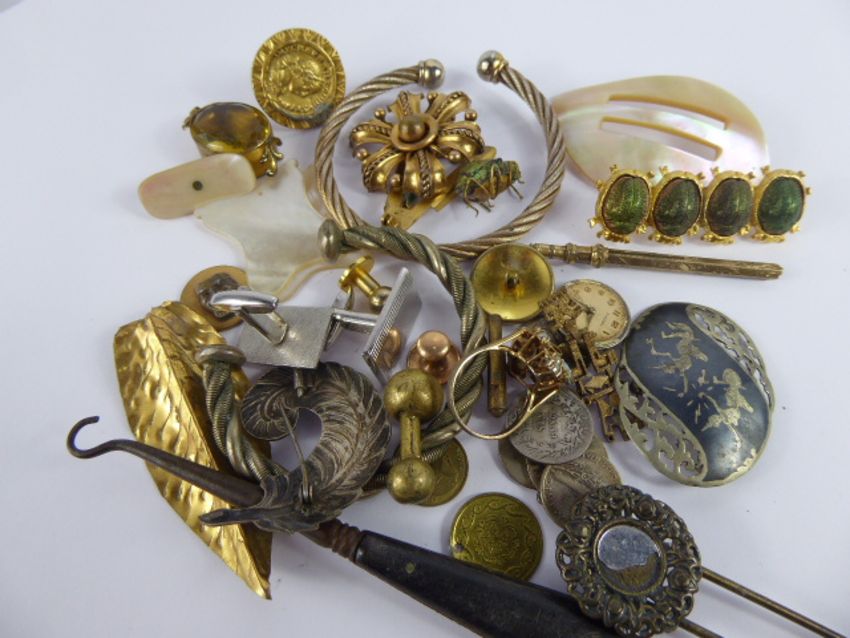 An Miscellaneous Collection of Antique and Other Costume Jewellery, including scabbard beetle brooch, bangles, mother of pearl counters together with a quantity of cultured pearls.