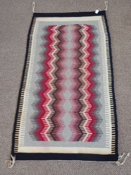 A North American Navajo Indian Blanket/Rug, of geometric design with pink, claret, grey and brown ground, approx 128 x 71 cms.