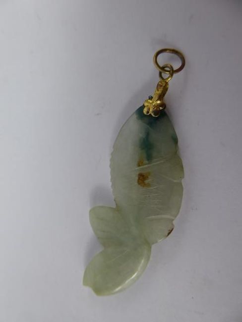 An Antique Chinese White and Green Jade Hand Carved Pendant, depicting a fish, approx 4.5 cms with gold mount. (af)
