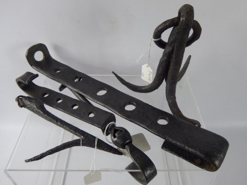 A Quantity of Antique Cast Iron Fireside Meat Hooks, four prong game hook, adjustable pot hangers. (4)