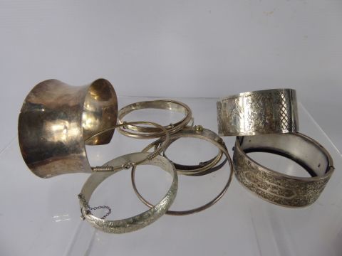 A Miscellaneous collection of Silver Bracelets and Bangles, hand engraved, one depicting swallows, approx total wt 200 gms.