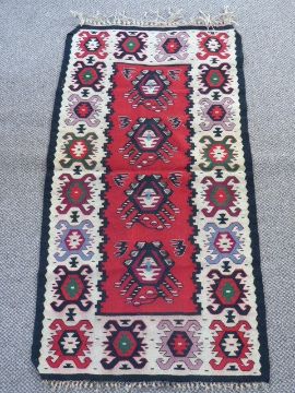 A Turkish Sharkoy Kilim Rug, of geometric design, claret, black and blue central design on a red ground, approx 120 x 65 cms.