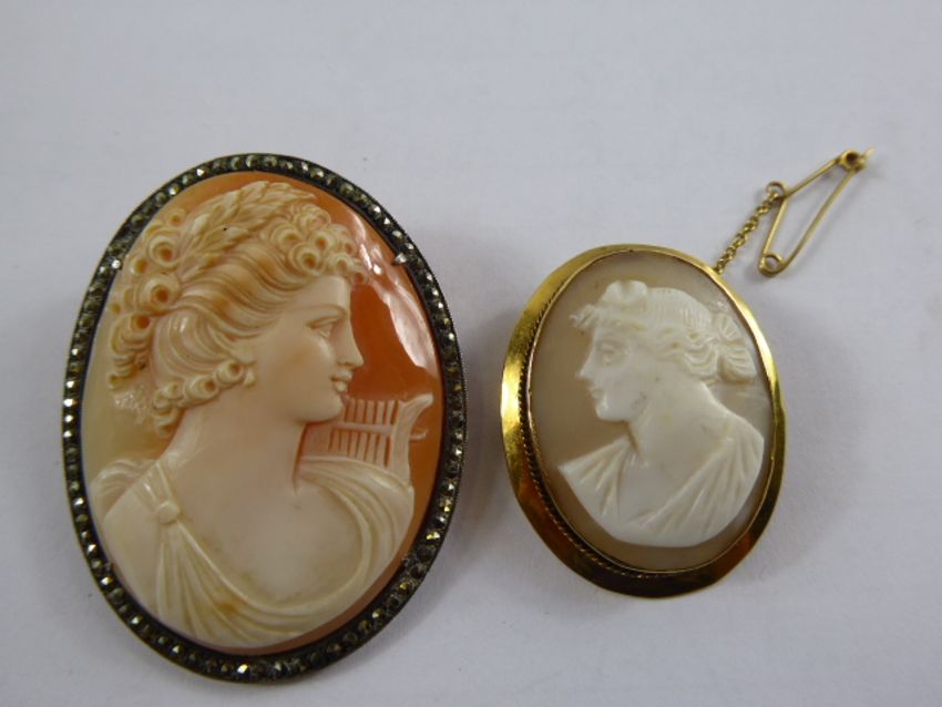 A Lady's Victorian 9ct Gold Cameo Brooch, depicting a classical profile together with one other marcasite surround cameo brooch. (2)