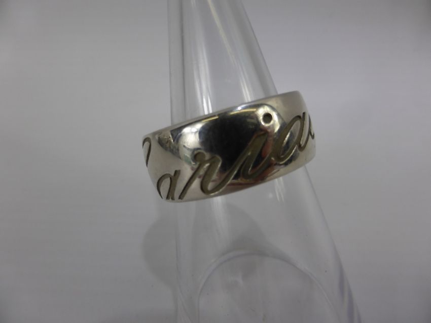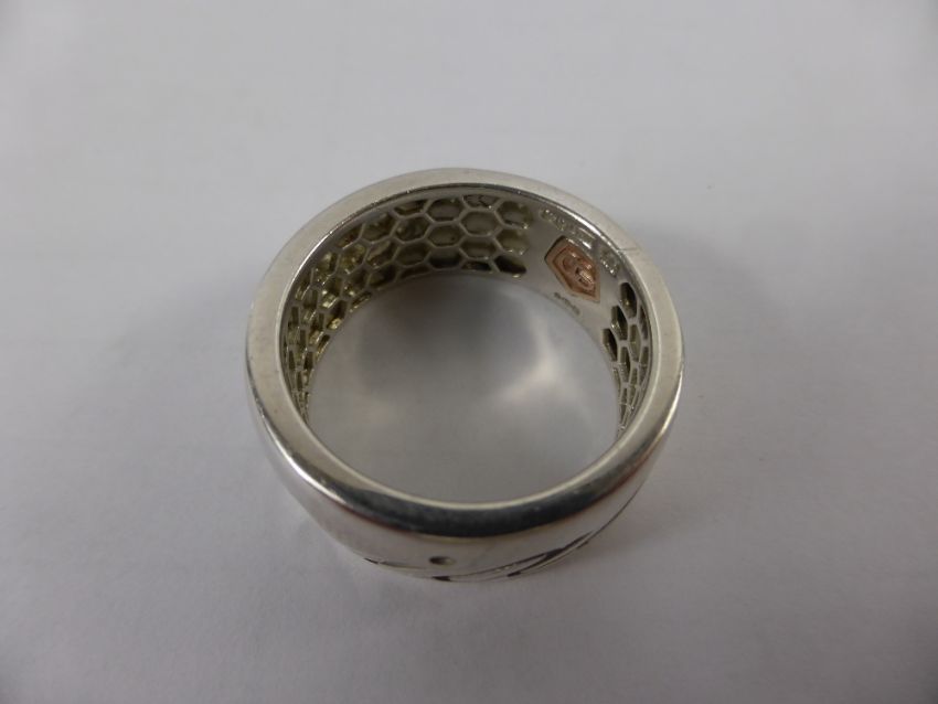 A Solid Silver Clogau 925 Hallmark Ring, the ring inscribed 'Cariad' and having the gold CG motiff to band, size Y, approx wt 14 gms.