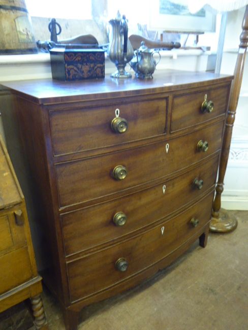 An English Regency Mahogany Bow Fronted Chest of Drawers, two short drawers over three long drawers, splayed feet, brass circular handles, satinwood inlay, original condition, circa 1800-1820.