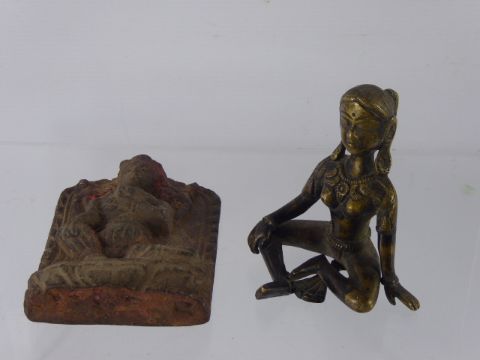 An Antique Hard Stone South East Asian Plaque of a Deity, approx 11 cms, together with a brass seated figure approx 10 cms. (2)