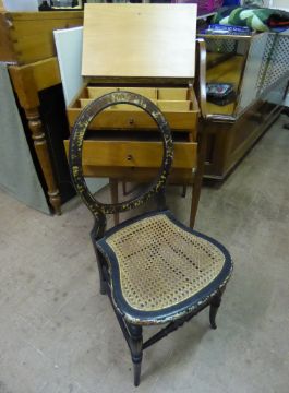 A Victorian Rattan Seated Lacquered Bedroom Chair, together with a teak fronted sewing box. (2)