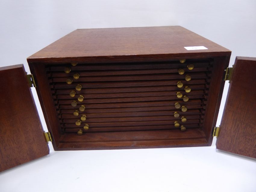 A Handmade Mahogany Coin Collectors Storage Cabinet, containing fourteen pullout slides, approx 20 x 20 x 15 cms.