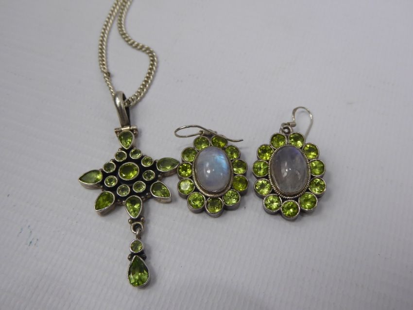 A Lady's Silver Green Stone Drop Pendant Necklace, together with matching earrings, approx 28 gms.