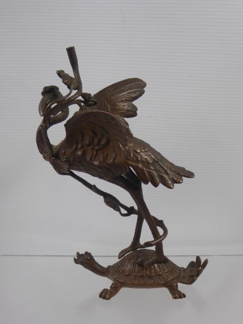 An Antique Bronze Figure of a Crane beside a Turtle, approx 20 cms, (possibly was a candle holder) af