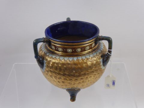 Royal Doulton Lambeth Ware Trig, the vessel of circular form and covered with layered circular swirls. The three handles are glazed similarly to the feet with the same raised design. The short neck has a band of brown glaze raised with flowers. The inside of the mouth is glazed blue, approx 15 cms. (af)
