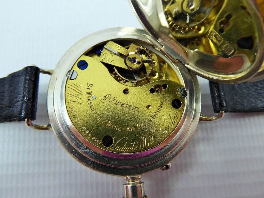 A Gentleman's Solid Silver and Enamel Self Wind Half Hunter Trench Watch, by H.W. Benson, London, the case London hallmark dd 1922, mm J.W.B., the 3/4 back plate nrd 1061871 and engraved H.W. Benson by Warrant to H.M. The Late Queen Victoria. The watch having a white enamel face with Roman numerals, minute dial and blued hands, the face measuring approx 4 cms.