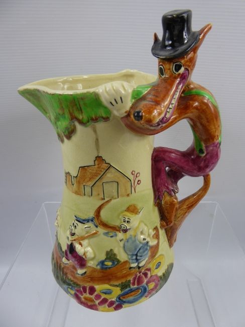 A Vintage Musical Water Pitcher, decorated with the Nursery Rhyme Three Little Pigs, approx 20 cms.
