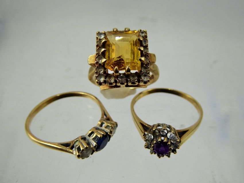 A Lady's 9 ct Gold Blue and White Stone Ring, size T together with another 9 ct gold amethyst ring size T, together with a Art Deco 9 ct Gold size O approx 10.3 gms (af)