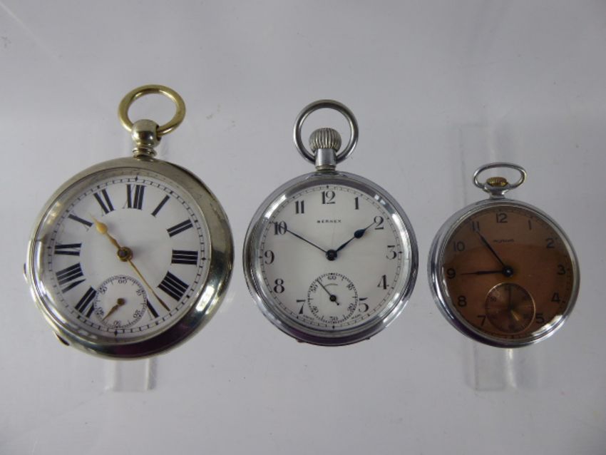 A Chrome Vintage Open Face Pocket Watch, together with a Bernex chrome pocket watch, a vintage Russian pocket watch having a rose gold metal face with subsidiary dial and blue gun metal hands, engraved Kamhen (3)