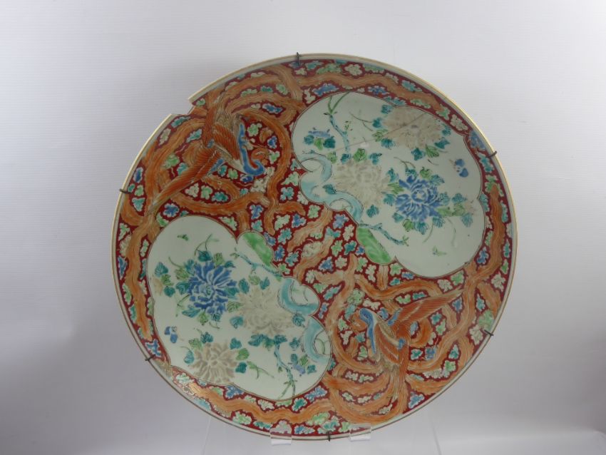 A 19th Century Chinese Charger, with panels depicting blue chrysanthemum and phoenix, approx 47 cms diameter. (af)