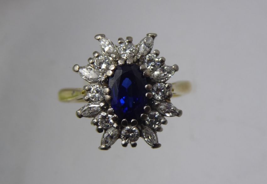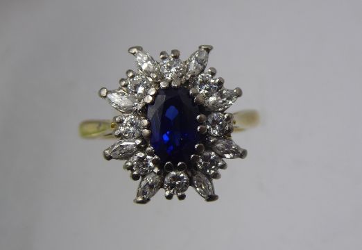 A Lady's 18 ct Yellow and White Gold Sapphire and Diamond Ring, the sapphire 7.7 x 5 mm, 8 x round brilliant cut dias approx 36 pts, 8 x marquise cut dias approx 56 pts, size J, approx 4.7 gms