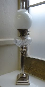 A Regency Style Corinthian Oil Lamp, the lamp having a cut-glass reservoir, approx 79 cms high.