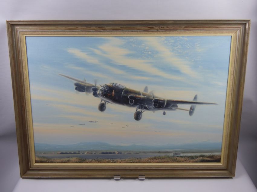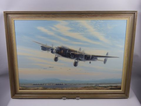 Chris Golds 1936 to Present, Oil on Canvas, depicting WWII Bomber planes returning home, signed lower right, framed, approx 74 x 50 cms, dated 1979.