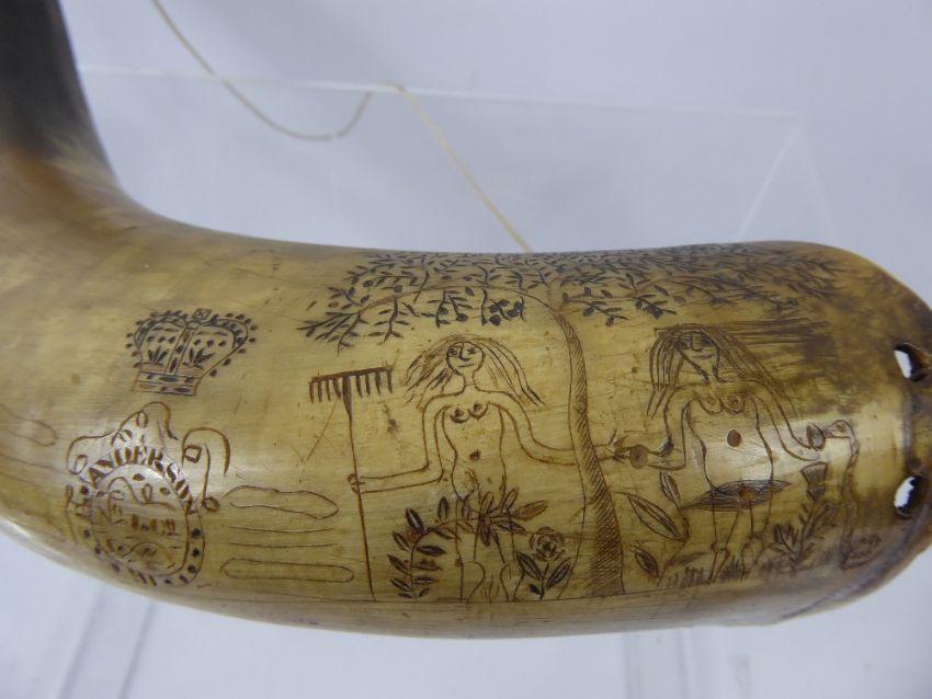 An Antique Bovine Horn Flask, engraved with Adam and Eve, with family motto Anderson, approx 37 cms long.