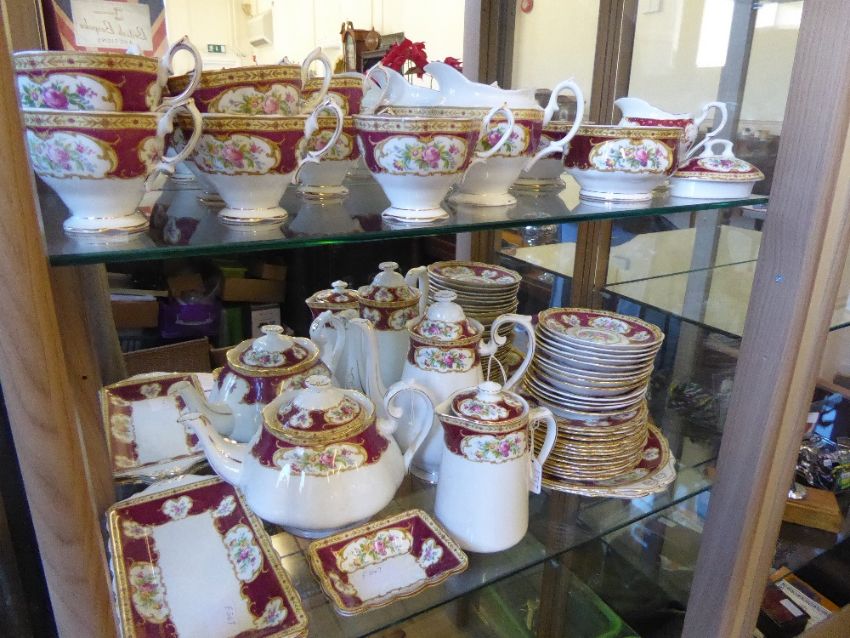 A Quantity of Royal Albert "Lady Hamilton" Porcelain, including eleven teacups, thirteen saucers, eleven tea plates, two sugar bowls, two oblong sandwich plates, two cake plates, one coffee pot, one teapot, one water jug with lid, two milk jugs, one creamer, two pin dishes, one extra oval shaped lid. (wf)