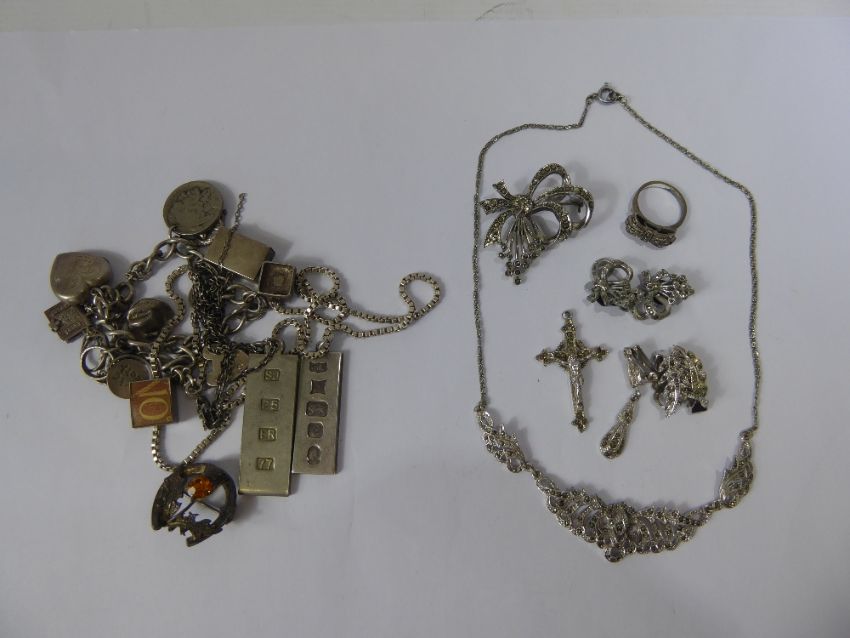 Miscellaneous Silver and Marcasite Jewellery, including charm bracelet, marcasite ring, ingot and chain, horseshoe brooch, together with white metal marcasite jewellery, approx 90 gms and a Gentleman's silver metal and turquoise Native American ring, size Z, approx 27 gms