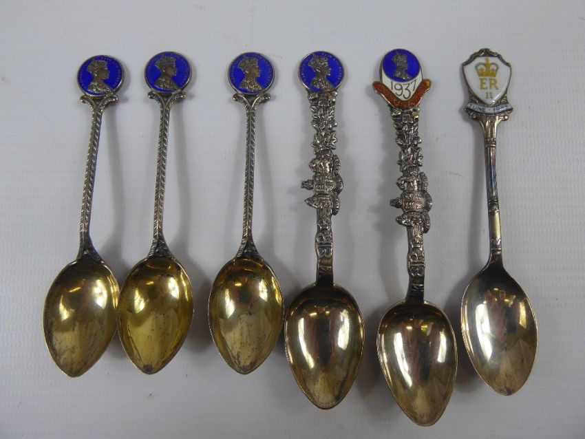 Miscellaneous Enamel King Edward VIII Coronation Spoons, together with an ERII Coronation spoon approx 80 gms. (7)