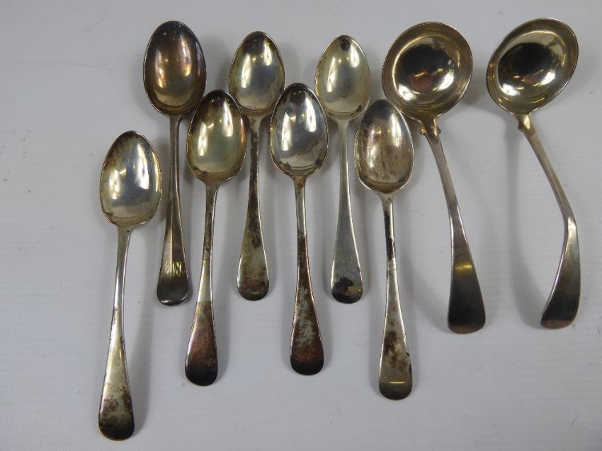 Six Solid Silver Teaspoons, Sheffield hallmark, mm Walker & Hall, dated 1901 together with a rat tailed teaspoon and two sauce ladles Birmingham hallmark dated 1912 mm S & Bm, approx 200 gms (9)