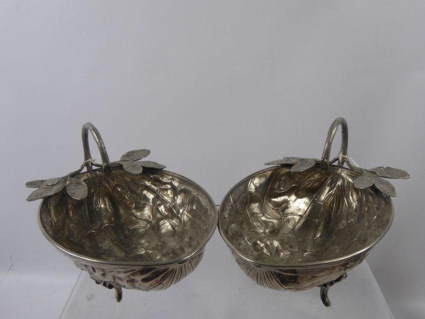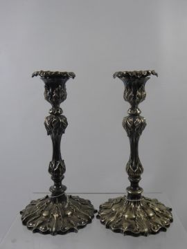Two Pewter Nut Dishes, in the form of walnuts together with two plated candlesticks. (4)