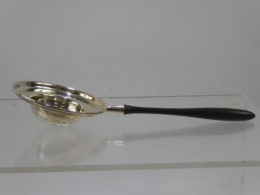 A Silver Tea Strainer, with ebonized handle, Sheffield hallmark, mm Walker & Hall, dated 1910, approx 80 gms.