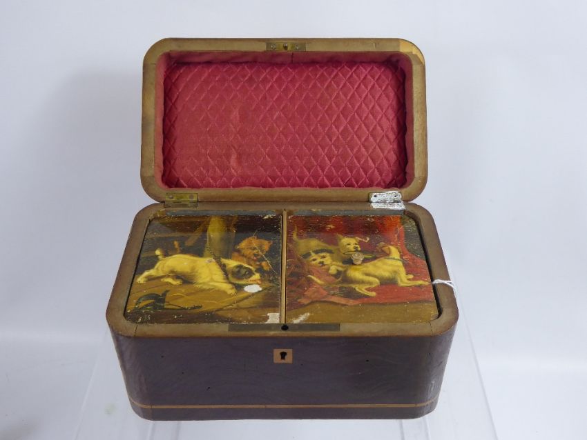 Antique Tea Caddy, the interior lids hand painted with dogs, approx 22 x 13 x 12 cms