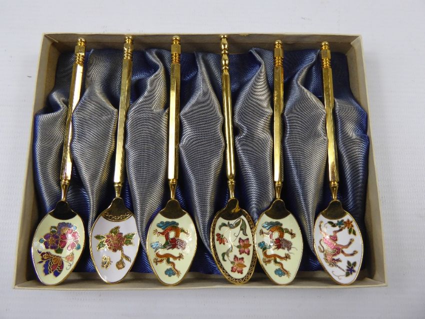 A Chinese Figure of a Man, together with a set of six enamel teaspoons.