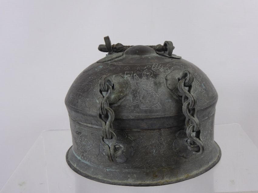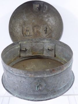An Antique Persian Hand Engraved Lidded Metal Container. The container engraved with feasting scenes and having chain hinge to back, approx 19 x 11 cms.
