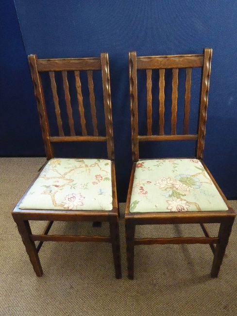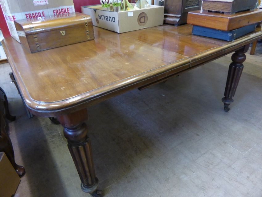 Edwards & Roberts Victorian Mahogany Wind Out Single Leaf Dining Table, on reeded legs and castors together with six Edwardian oak chairs, approx 147 x 108 x 73 cms