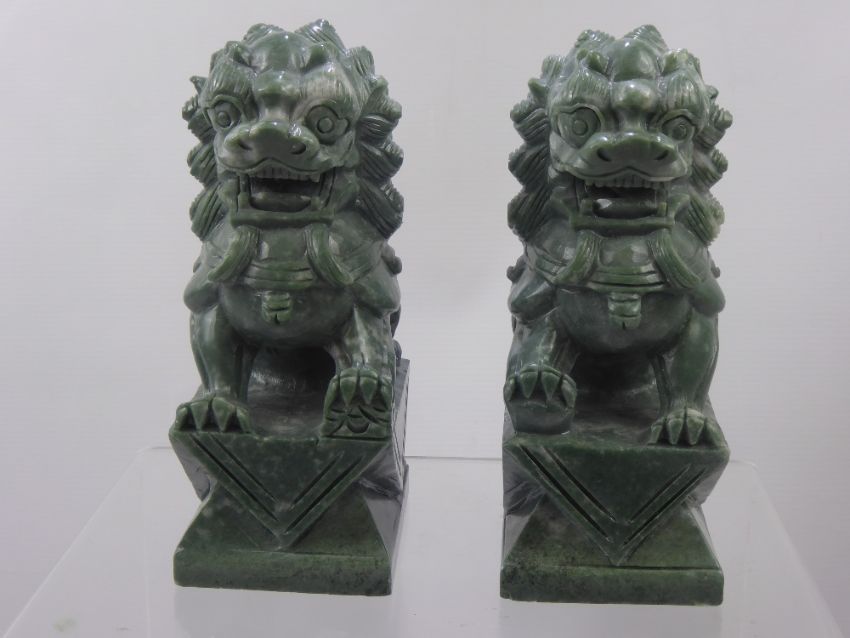A Pair of Soap Stone Oriental Carvings, in the form of guardian lions, approx 21 cms