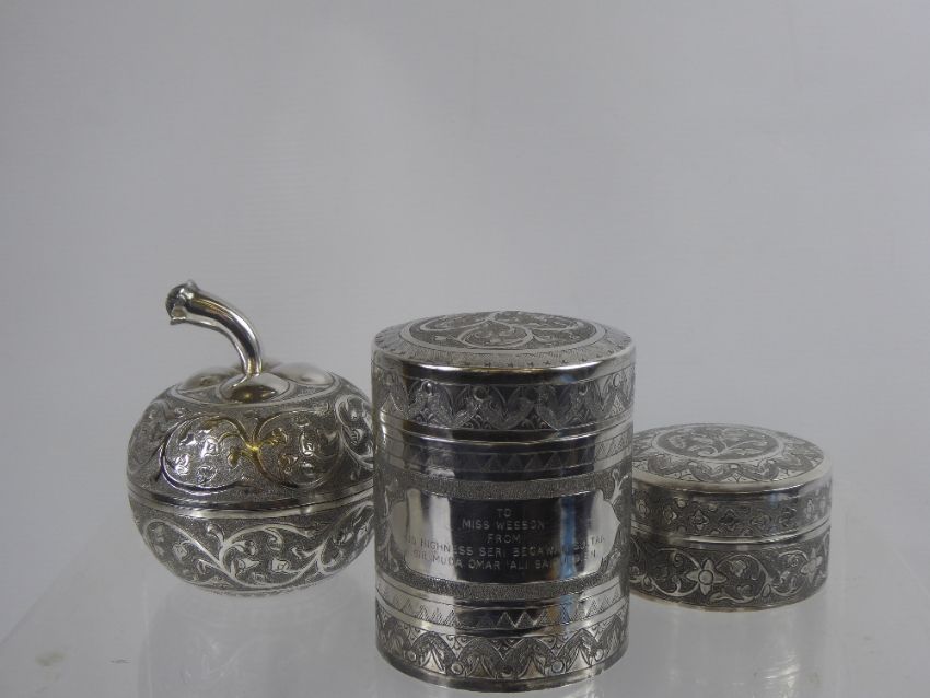 A South Asian Silver Canister & Cover, containing a lady's silver bracelet, the inscription reads "To Miss Wesson from His Highness Seri Begawan Sultan Sir Muda Omar Ali Saffuddien" with a smaller niello canister and cover, together with a silver canister and cover, in the form of an apple. The canister rim inscribed "Pengiran Abdul Aziz to M.E.W. May, dated 1979". (3)