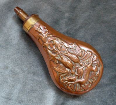 An Antique Copper Powder Flask, decorated with game scene, four position adjustable nozzle.
