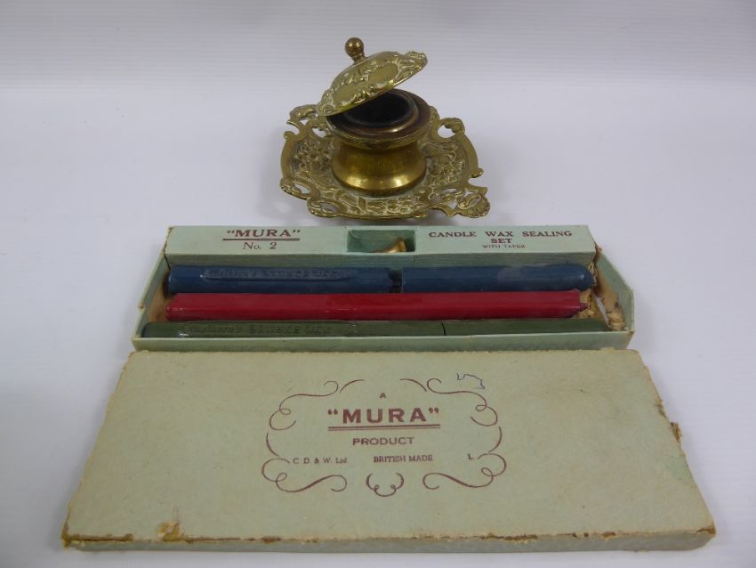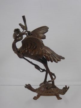 Miscellaneous Items including an antique brass ink well, with the original glass liner together with a vintage candle wax set with rose motif, antique bronze figure of a crane beside a turtle, approx 20 cms, (af), a pair of Chinese Cloisonné Vases, depicting birds amongst prunus and iris, approx 20 cms together with a miniature Crown Derby Plate. (4)