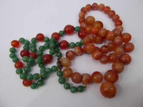 A Green and Orange Agate Bead Necklace, on silver clasp, approx 68 cms together with another part orange agate necklace with loose beads. (2)