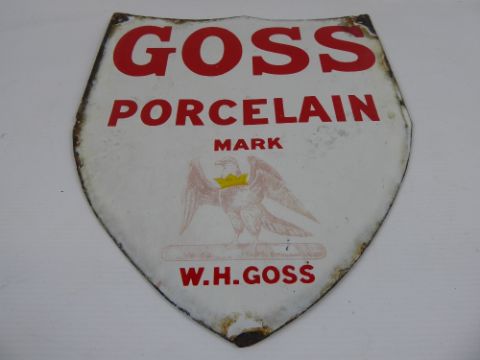 A Vintage Enamel Goss Porcelain Advertising Shield, the shield having the W. H. Goss logo, approx 26 x 30 cms.